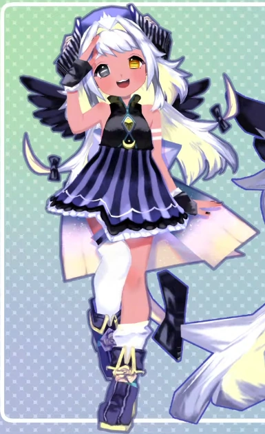 Mayoi has fair skin, and wears a black and purple dress with various accessories on it. her eyes are black (Left) and yellow (Right). she has silvery-white hair with yellow highlights, and the hair is accessorized with ram horns, roses, and a hat with a tiara on it. she also has a cape that fades from purple to yellow, socks that are both different lengths, gloves, black wings, and boots with roses on them.