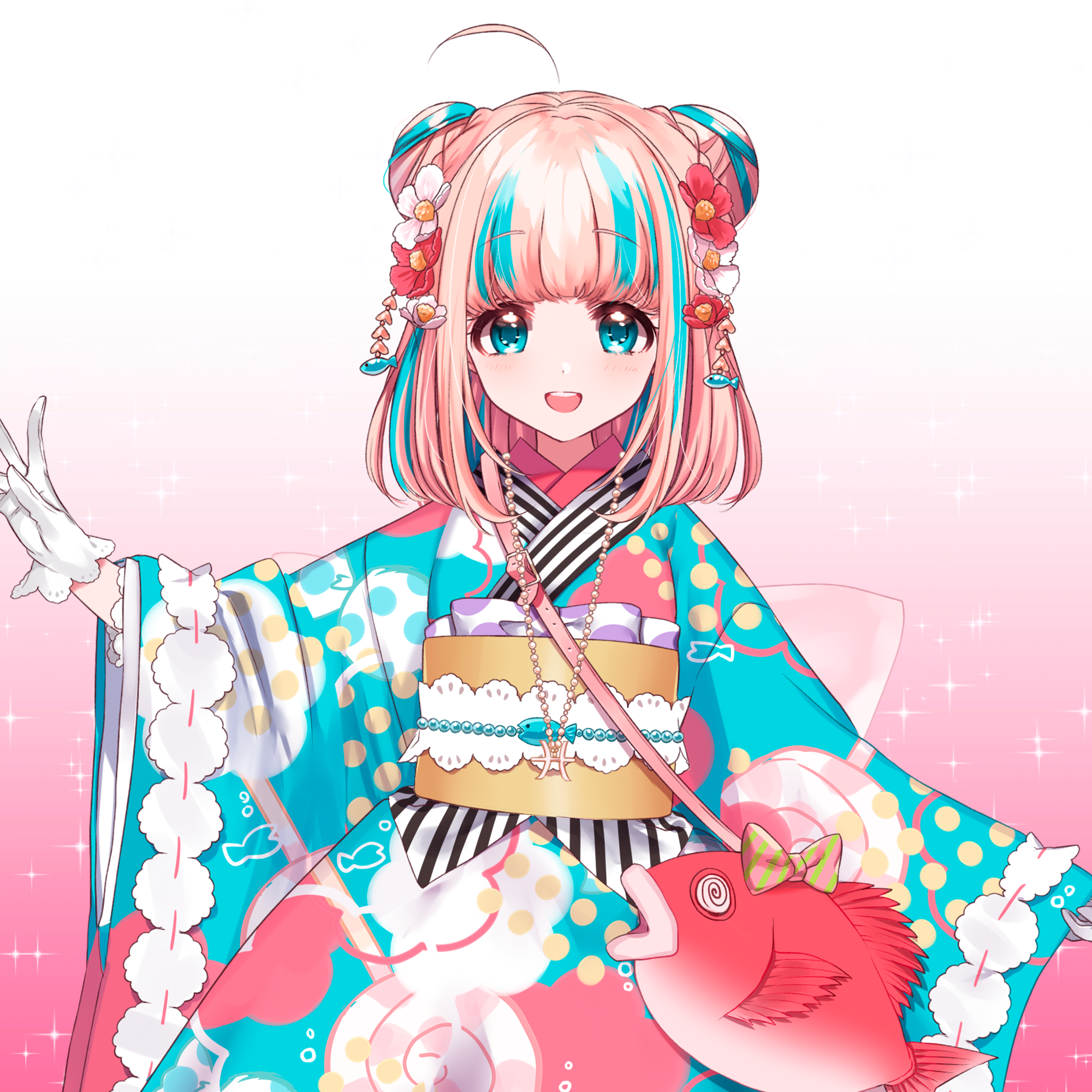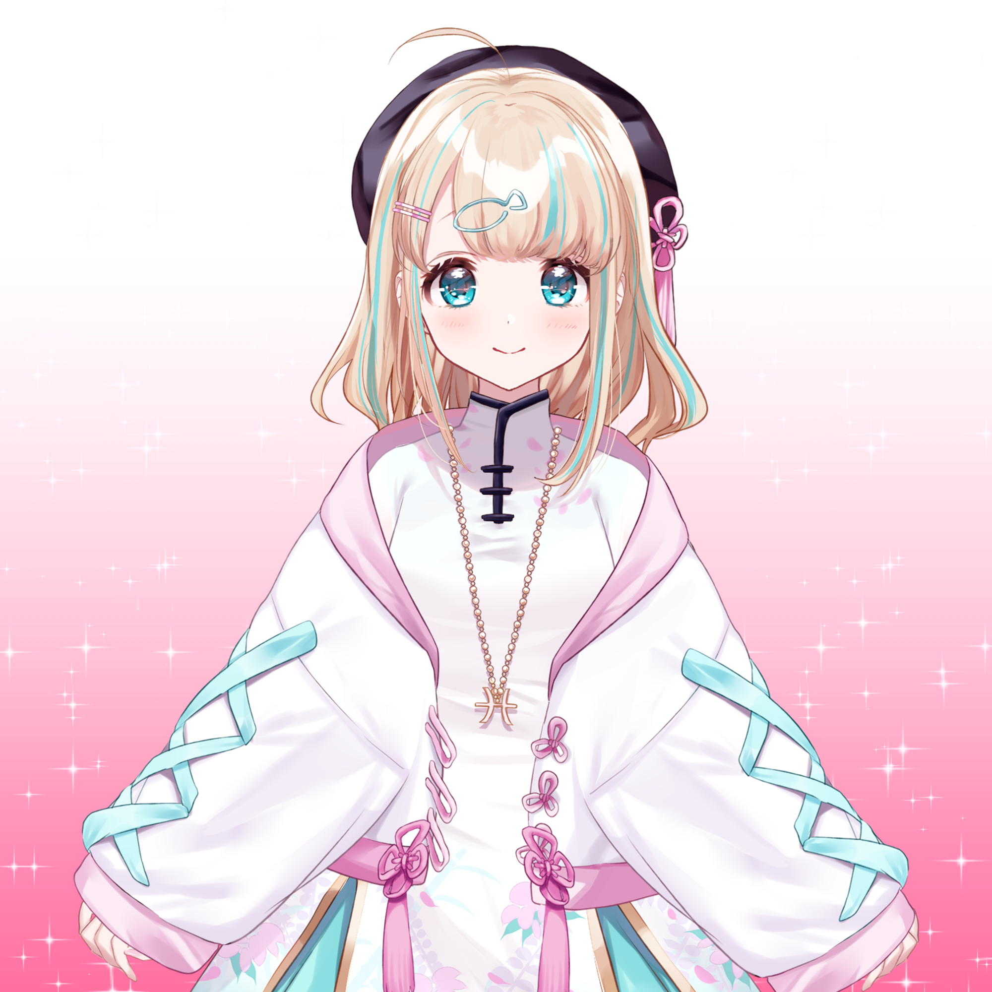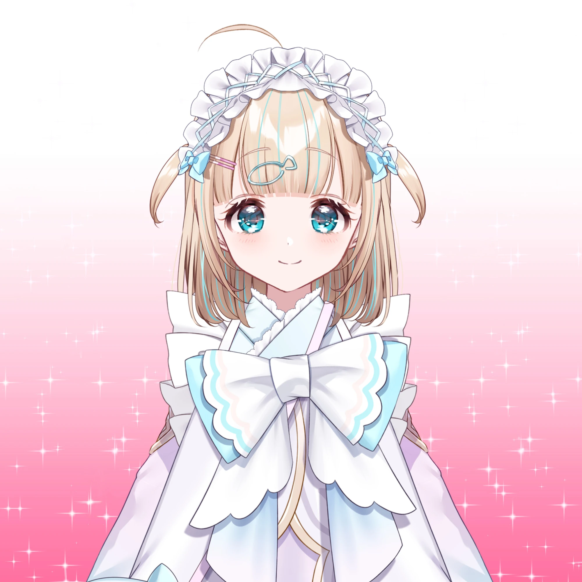 She has medium length blonde hair and ahoge with streaks of light blue and light blue eyes.